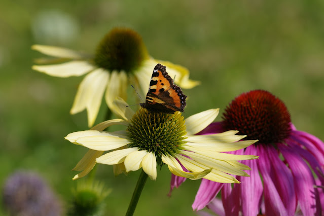 Bättre sent än aldrig och med värmen som har kommit så har fjärilar dykt upp. Jag blev glad när jag äntligen fick se en påfågelfjäril. Påfågelfjärilar tillhör mina favoriter och jag vill se minst en varje år. Jag är glad att rudbeckiorna kommer igen varje år för fjärilarna tycker väldigt mycket om dem. Det är så bra att det är många olika blommor i trädgården så att det finns något som blommar under en lång period. Hade insekterna kunnat tacka så hade de säkert gjort det.